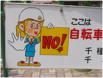These signs depict a blond lady holding up a sign that says NO! in English there is also Japanese writing. She holds her hand up which is enlarged just as in the Italian signs. However notice the expression on her face : she seems to be meek and uncomfortable with the message. She knows it’s impolite to say No! and she’s sorry she has to for the safety of the pedestrians and vehicles.