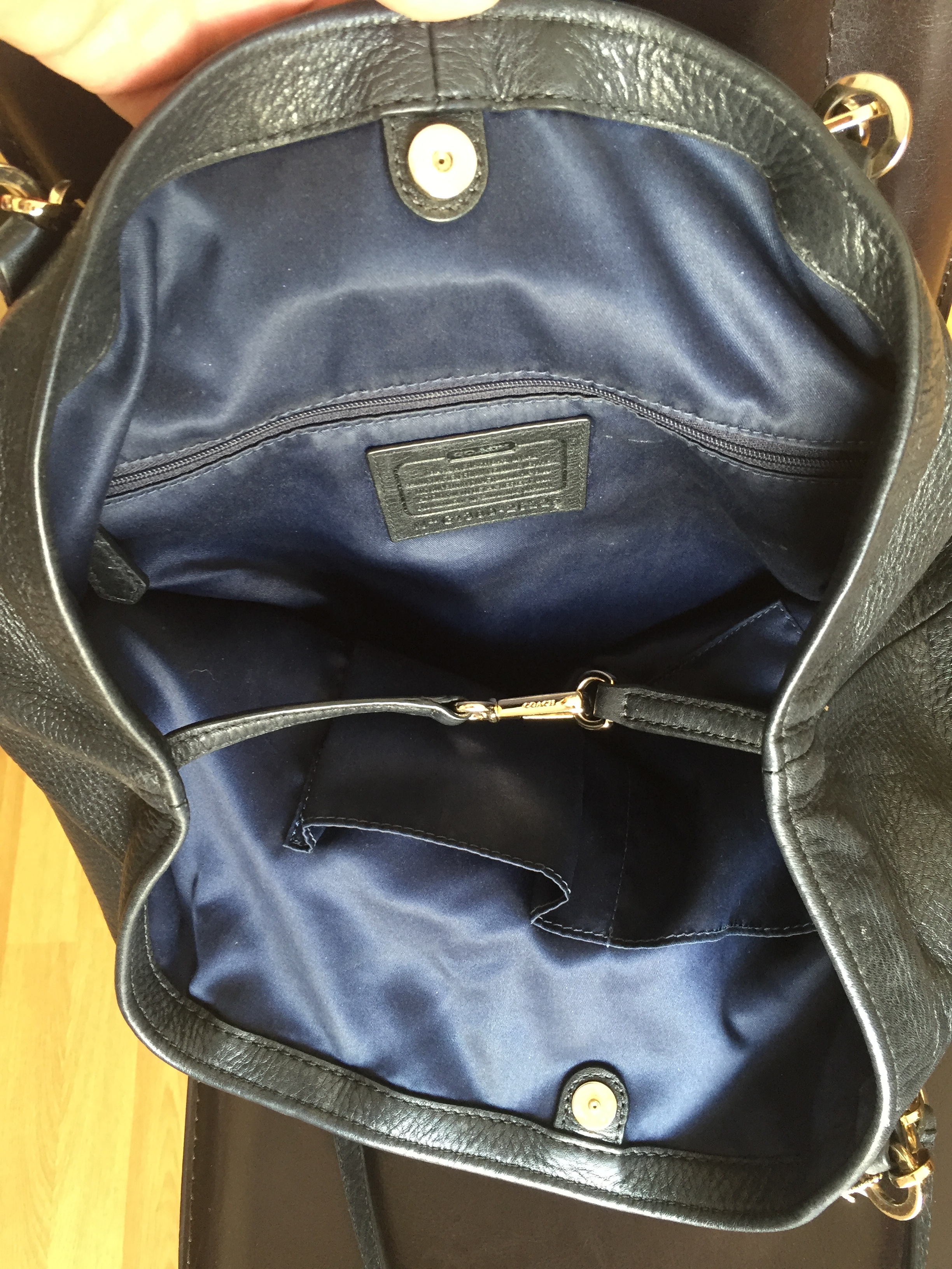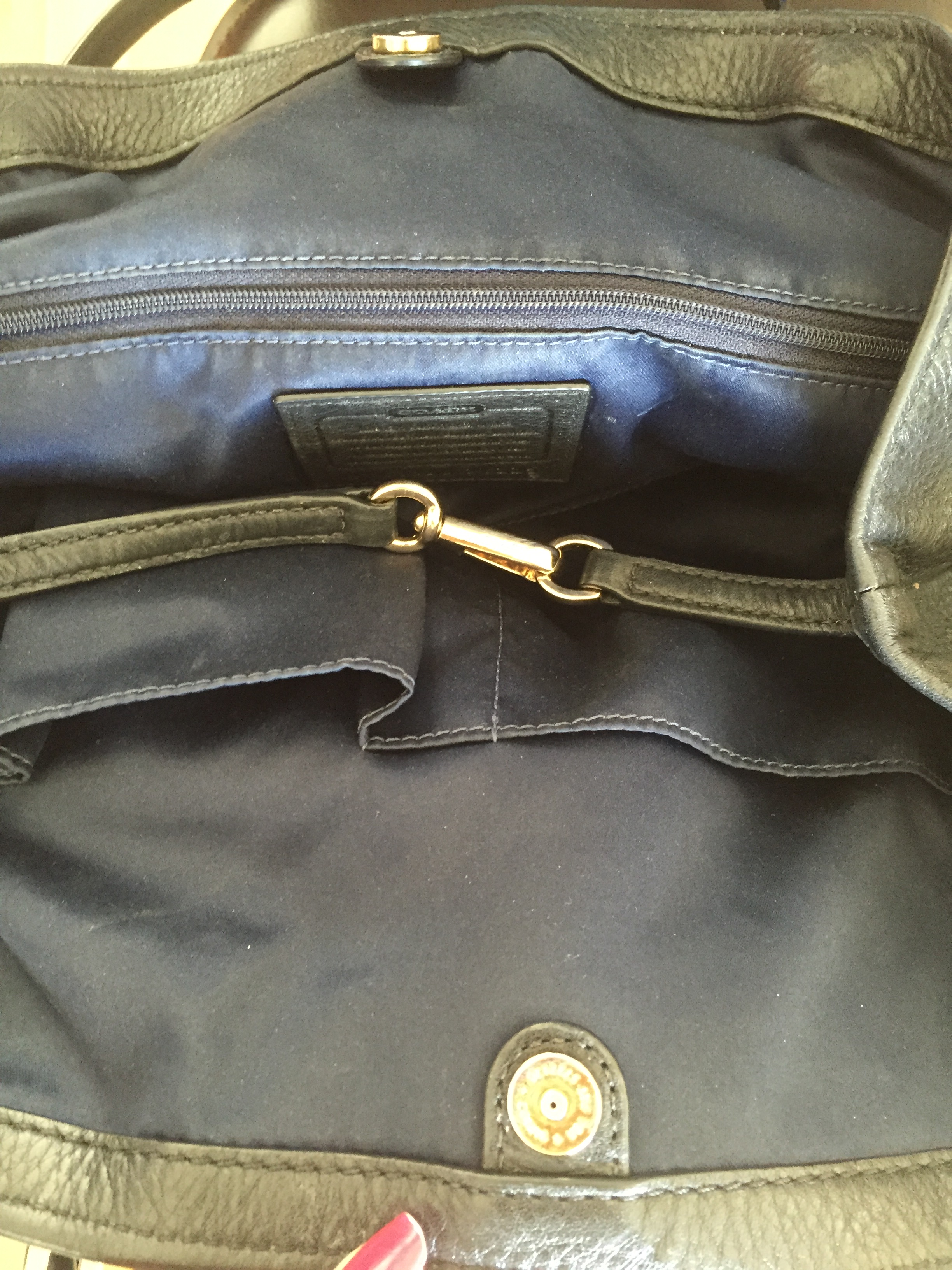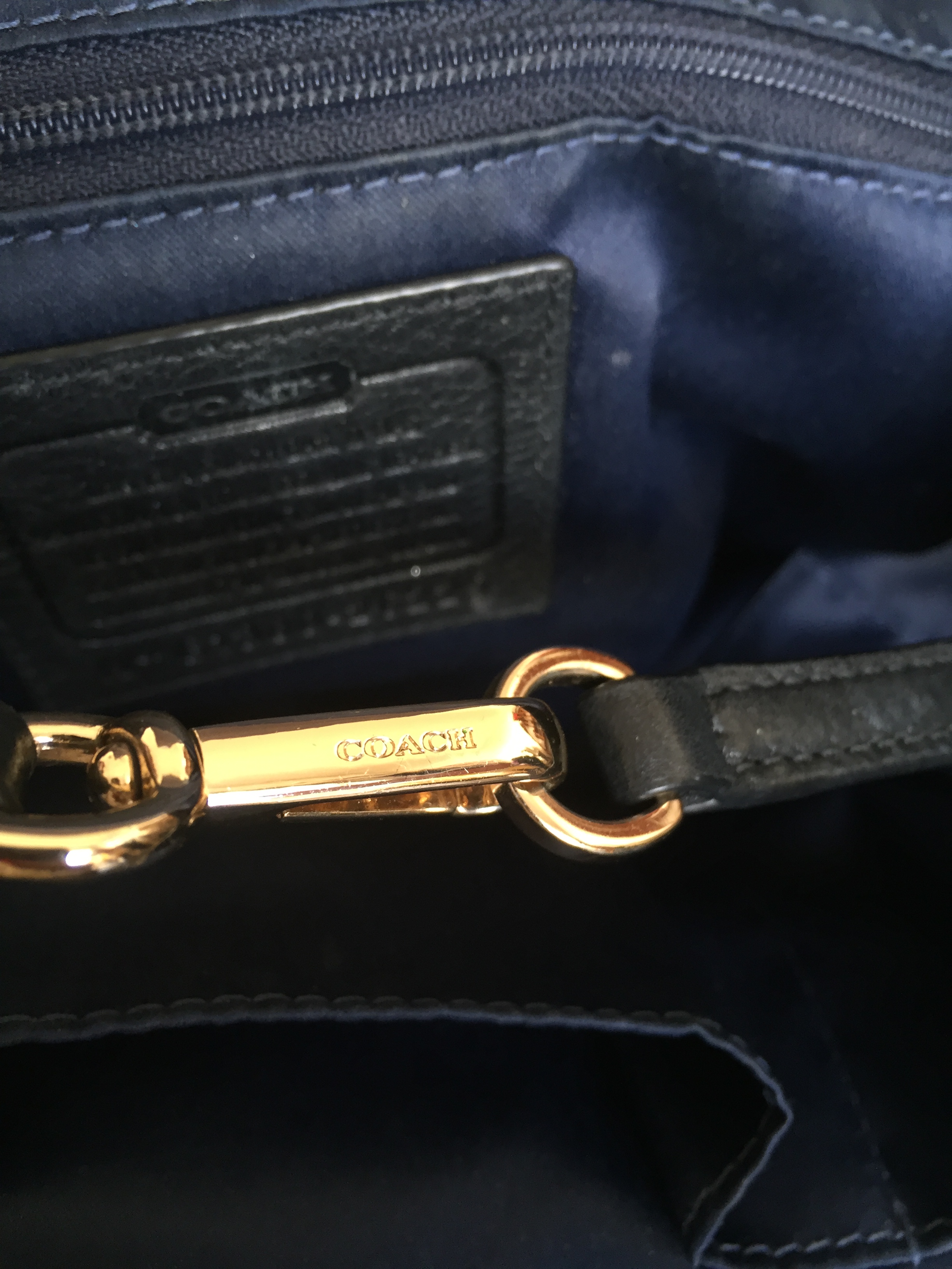 The interior fabric lining is a nice deep dark blue with the Coach creed patch.