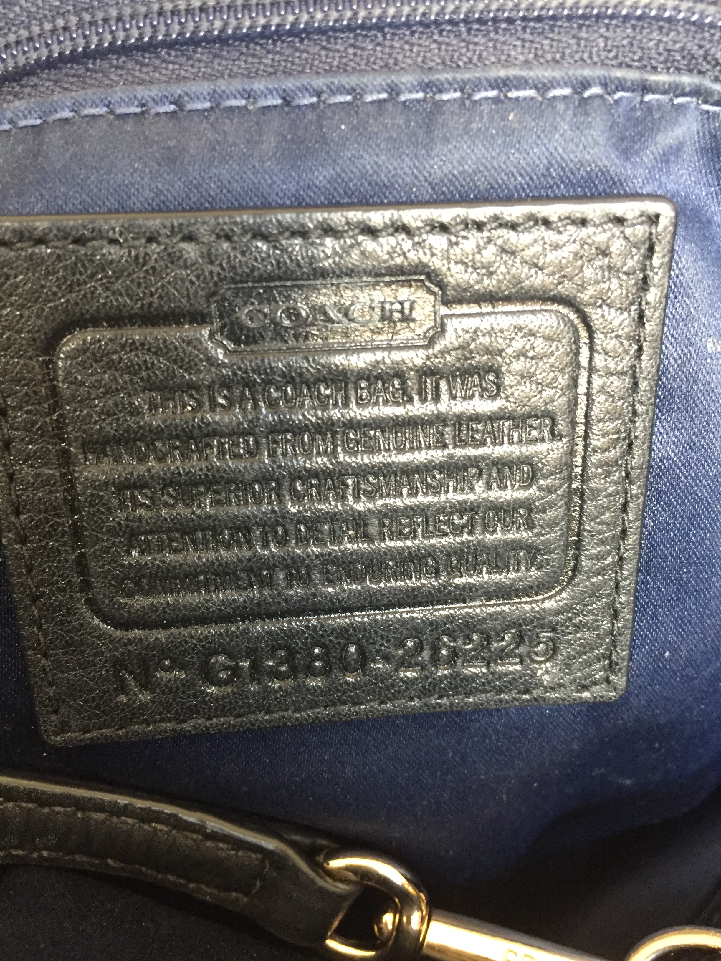 Registration numbers found on Coach creeds, usually contain 3-4 characters (number/letter combo) followed by the style number that is 3-6 characters long. Example: registration number F06S-8A16 is assigned to a large suede hobo bag that was made for the factory stores. The first group of numbers contains the year that the item was made. The “06” in F06S represents the year 2006. The second group of numbers is the style number, 8A16. A style number that is prefaced with “FS” denotes a Factory Style. My registration number reads G1380-26225.